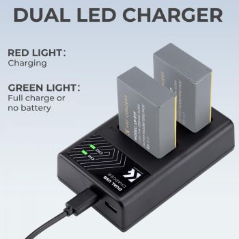 A porta de carregamento de slot duplo pode carregar rapidamente duas baterias LP-E17NH ao mesmo tempo, economizando muito seu tempo. Saída de corrente de carga de 700mA ao carregar uma bateria, 500mA quando ambos os slots de carga estão ocupados. (Nota: sem bateria, funciona melhor com entrada de corrente de 2,1A)