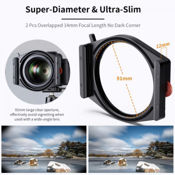 * Ultra-diâmetro ultrafino: O suporte tem 12mm de espessura e possui uma abertura transparente de 91mm. Reduz efetivamente a possibilidade de vinhetas ao usar lentes ultra grande angulares.